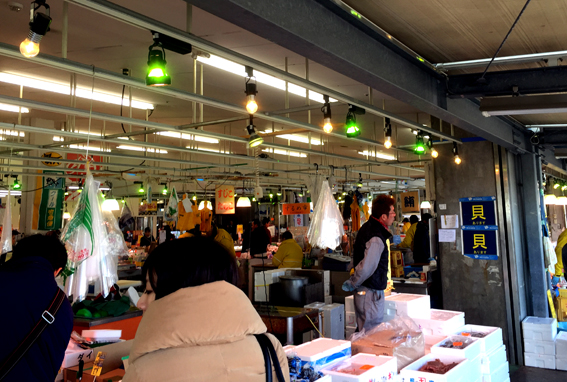 中の魚市場は新鮮な魚介類を買い求める客で賑わう